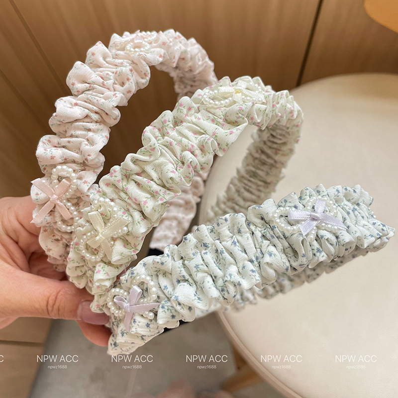 韓国風花柄プリーツ小粒パールリボンヘッドバンド女性用、甘い女の子用ヘアプレスヘッドバンド、高頭頂ヘアアクセサリー