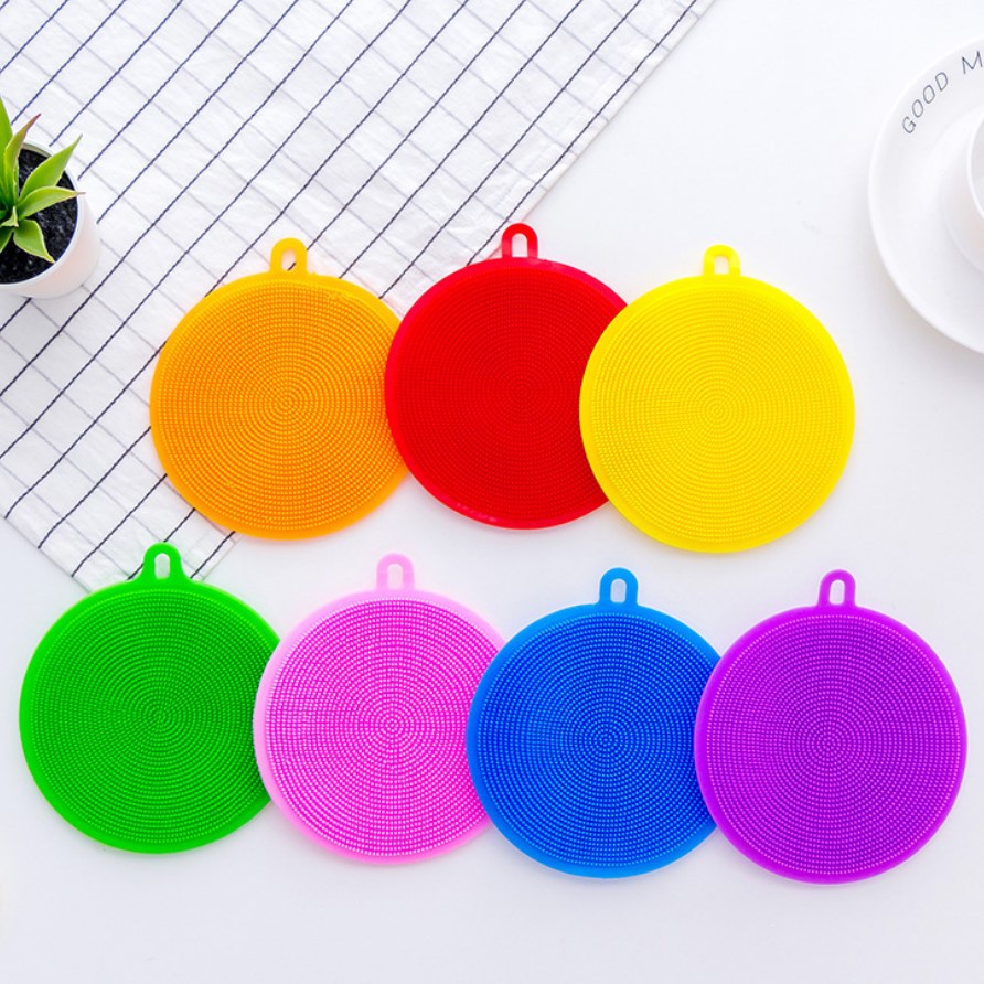 円形の皿洗いブラシと皿洗いの台所の家庭用食器の雑巾と雑巾を使って、鍋の果物と野菜の果物を洗ってブラシをかけます。