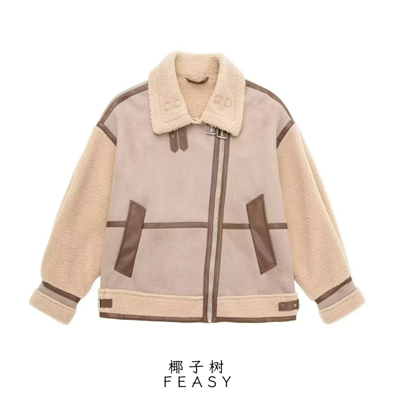 アマゾンの国境を越えた外国貿易欧米の婦人服の2024秋の新型は皮革をまねてジャケットのコートをつなぎ合わせます。
