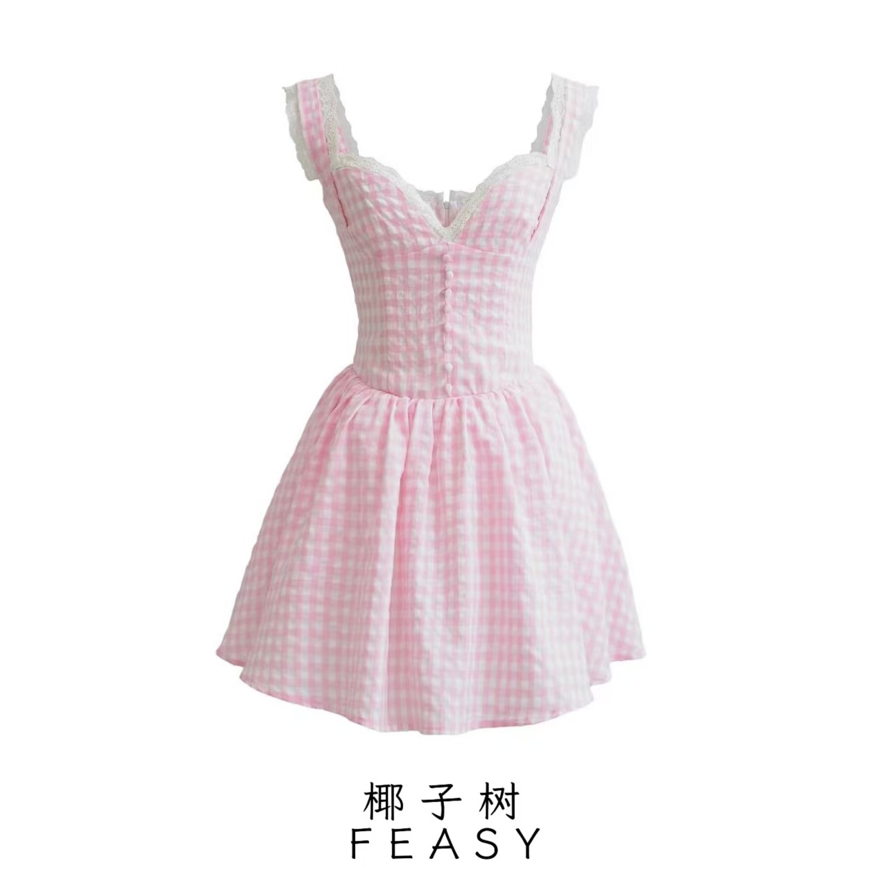 アマゾン国境を越えた対外貿易欧米女装2025春の新型粉格子レースのボタンストラップワンピース