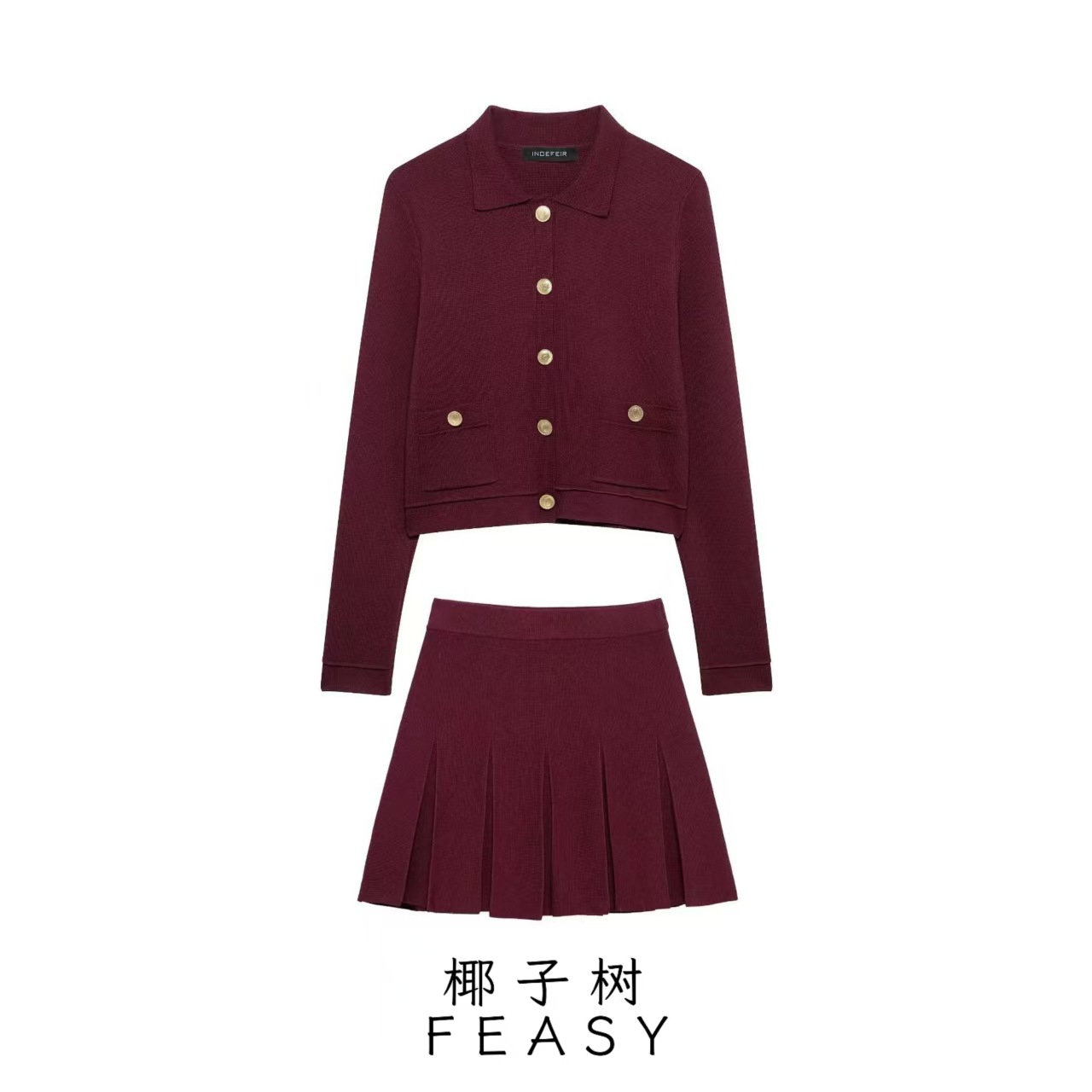 アマゾン国境を越えた対外貿易欧米の女装2024秋冬の新型襟付き長袖ニットコートのスカートセット