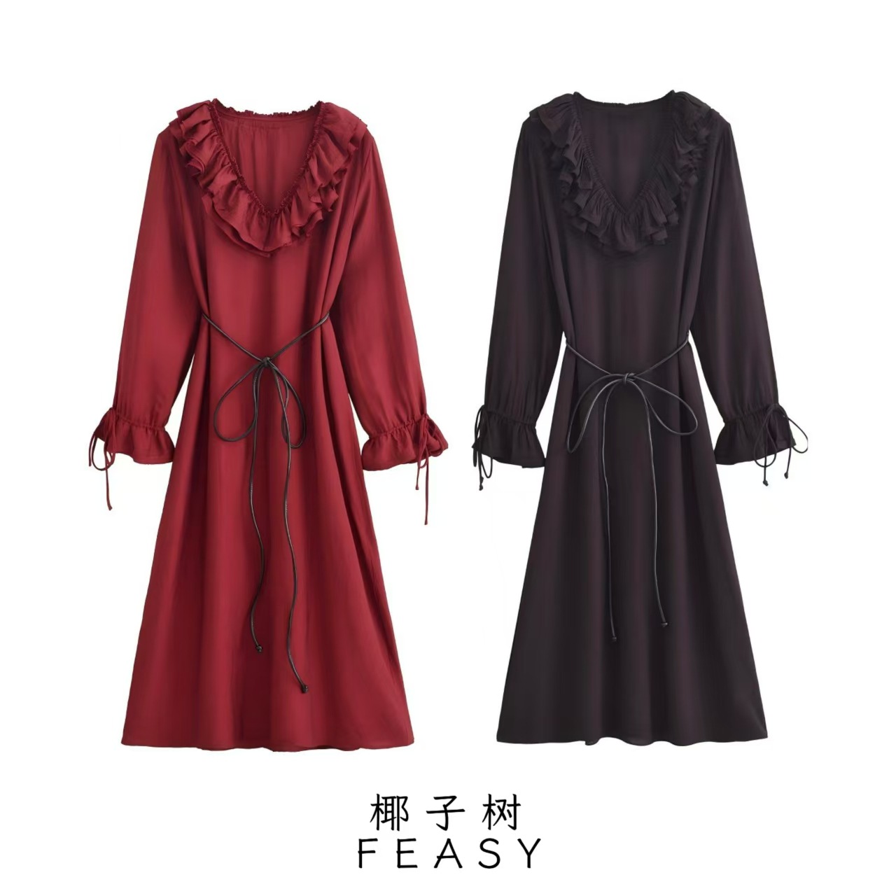 アマゾンの国境を越えた対外貿易欧米の女装2024秋冬の新しい街頭ファッションの重ね層にベルトのワンピースがついている