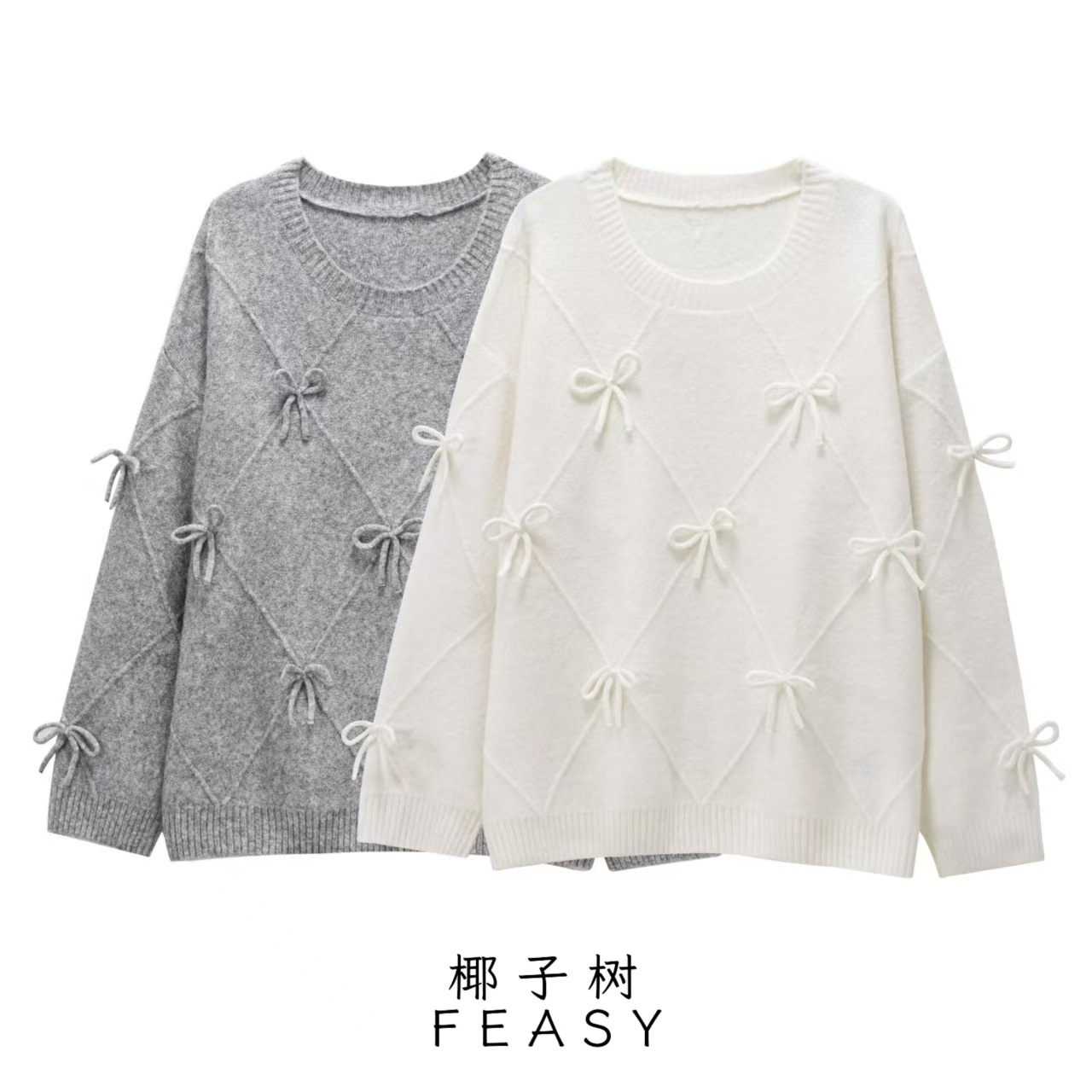 アマゾンの国境を越えた対外貿易欧米の婦人服2024秋冬の新型の蝶結びの白い灰色のポリエステルの丸首の長袖