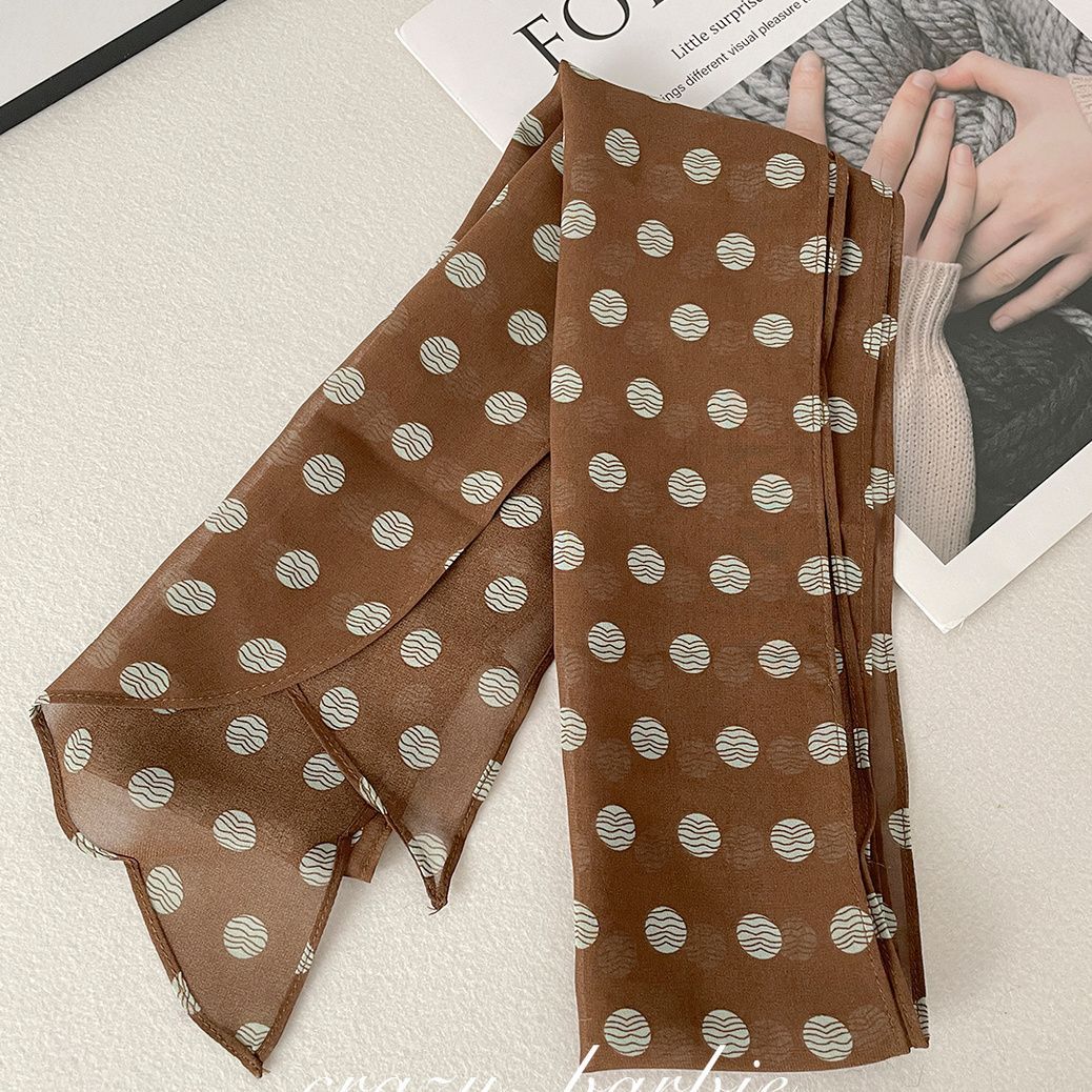 茶色の波点シルクタオルのプリントの高級な百合アクセサリーは首の女性の2025年の新型のヘアバンドを結んで長いマフラーを結びます。