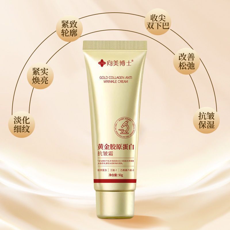 Dr. Xiangmei のゴールデン コラーゲン アンチリンクル クリームは、しわや凹みを保湿し、潤いを与えます。