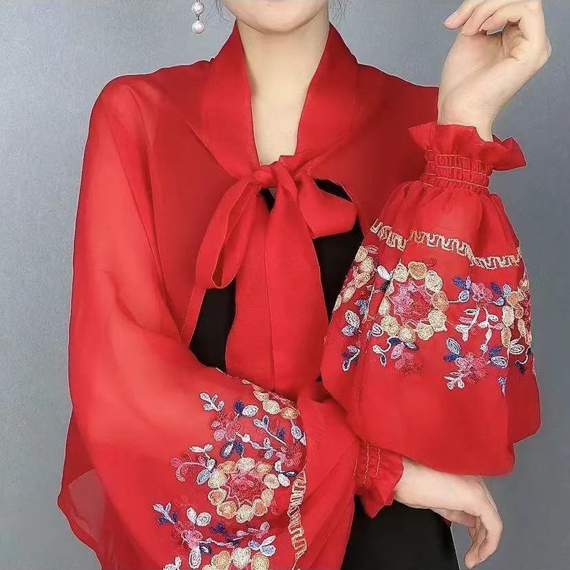 夏プリント刺繍シフォン空調カーディガン日焼け止めショールサスペンダースカート付き長袖万能トップジャケット