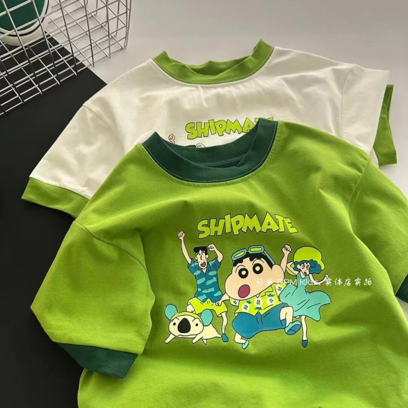 子供の新型の美しい子供の男女の子供の韓国版の子供服の緑色の流行の洋気の純綿のtシャツの半袖の漫画
