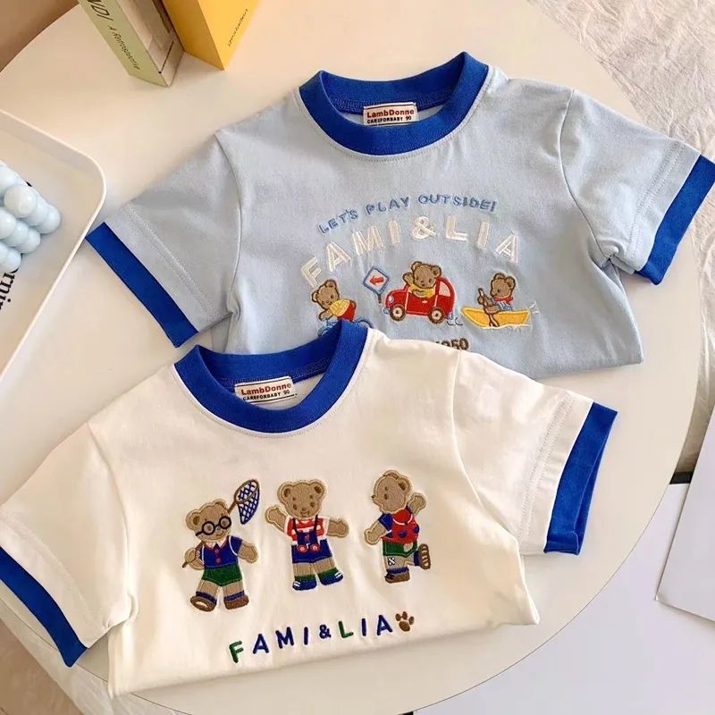 子供の純粋な綿の半袖 Tシャツ男の子と女の子のための 2025 夏の新しい漫画刺繍薄い通気性半袖 Tシャツトップトレンディ
