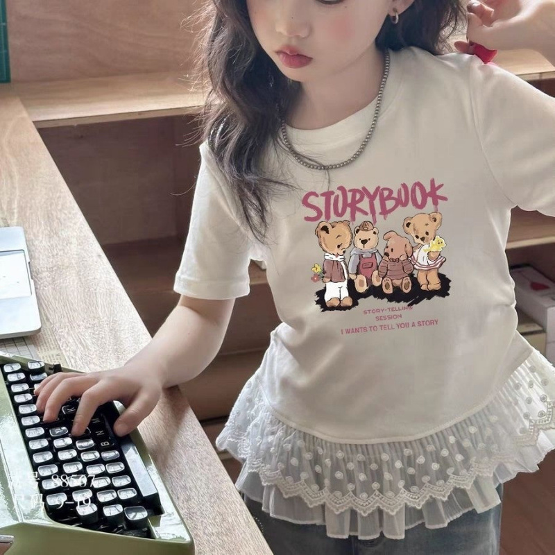 子供服、女の子、中型、大型子供用カジュアルトップス2025夏新作半袖白レース半袖トップス人気スタイル