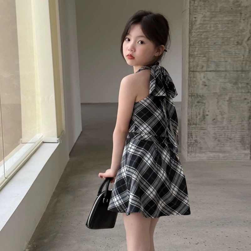女の子サマードレス子供のファッショナブルなプリンセスドレス 2025 新しいベビーファッショナブルな卵ガールノースリーブチェック柄スカート