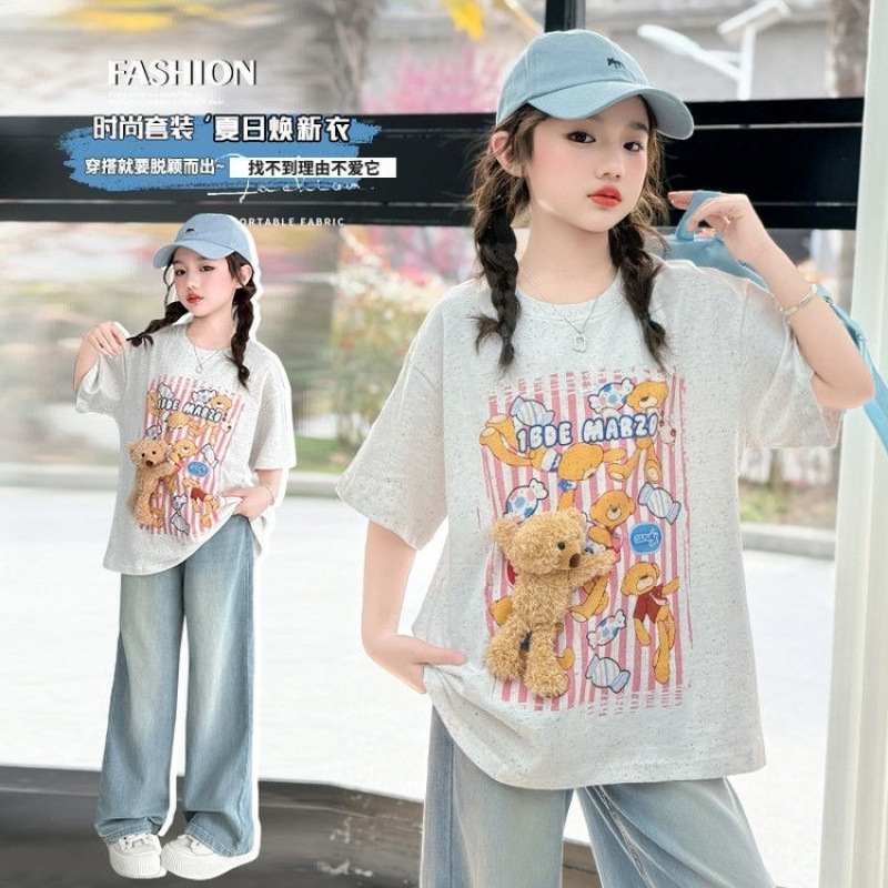 2025年女の子中大子供半袖スーツジーンズ夏カジュアル2点セット