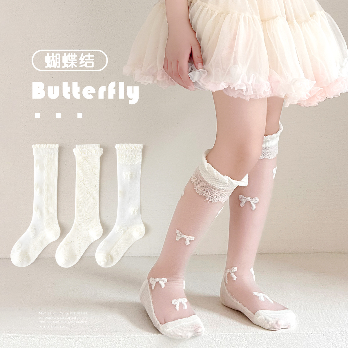 女の子春夏ふくらはぎ靴下蝶結び無骨レース靴下甘いお姫様風純色学院風高筒靴下