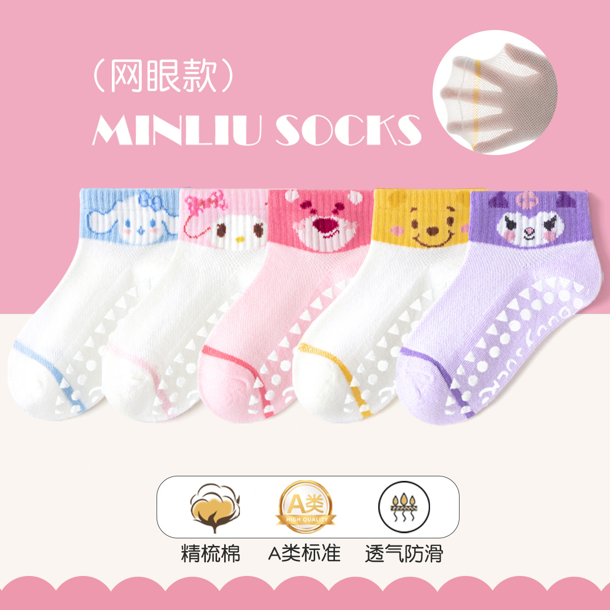 2025春夏の滑り止めの床の靴下の子供の靴下の薄いタイプの通気性の室内の涼しいアニメの綿の靴下の男女の子供の靴下