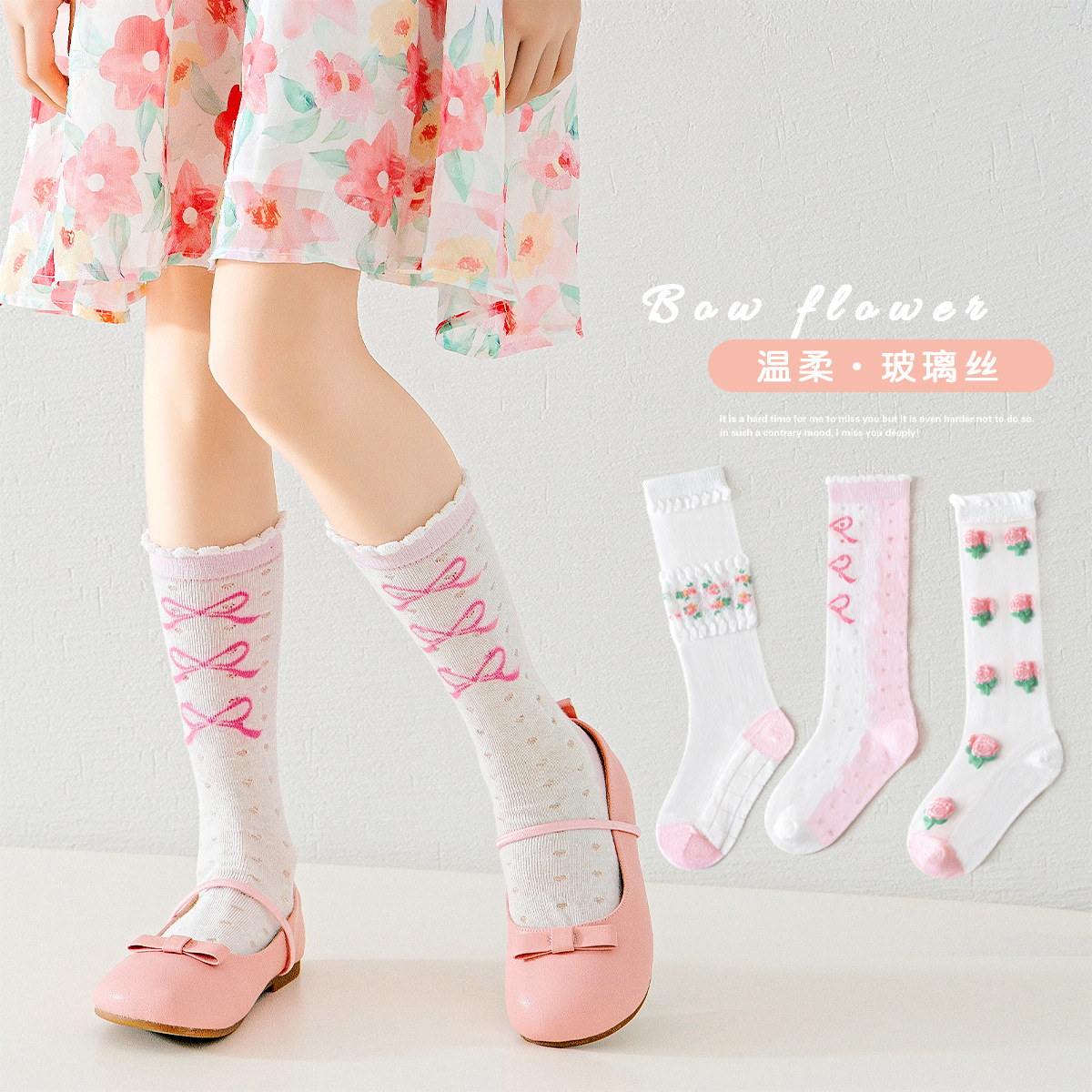 敏ドリアンの女の子のふくらはぎの靴下の夏のガラスの糸の薄いタイプの子供のレースの蝶結びの女性の赤ちゃんの韓系の長い筒の靴下