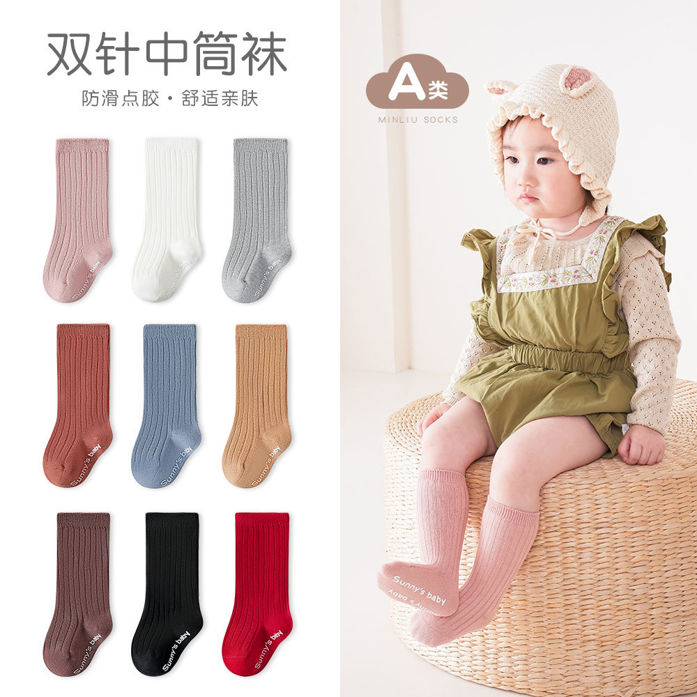 敏榴秋冬新作子供用靴下双針純色無骨赤ちゃん靴下韓国潮範男女子供中筒綿靴下