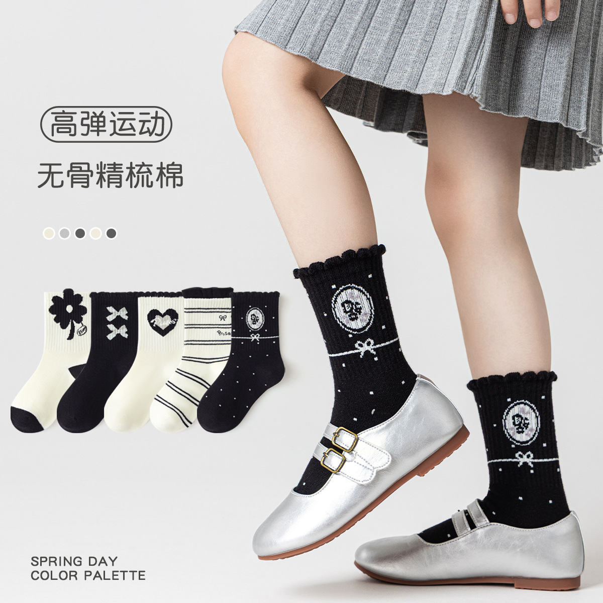 秋冬女の子靴下黒と白のスポーツソックスコーマ綿ボンレス子供靴下ミッドチューブラブフラワークラスAトレンディソックス