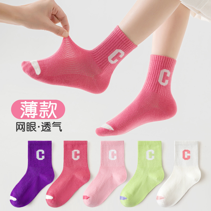 子供用靴下春夏の通気性綿の靴下の女の子の高いゴムのアルファベットのファッションの靴下のネットの目の中で大きい子供の運動の靴下