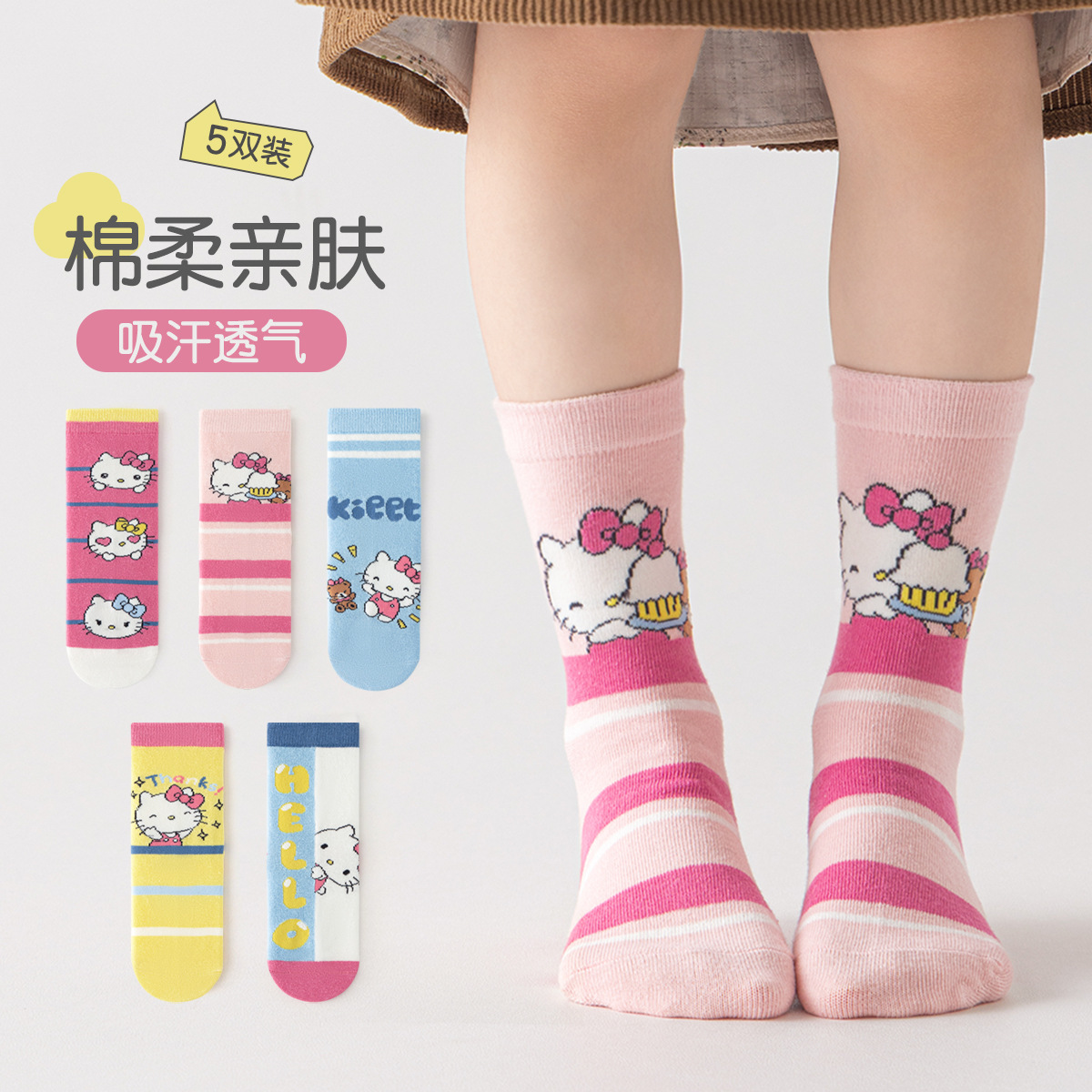 2025 秋と冬の子供の靴下漫画ミッドチューブソックスピンク猫中型子供クラス A 綿の靴下男の子と女の子の靴下