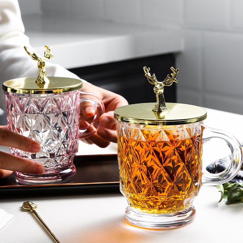 緑典現代シンプル小清新鹿頭ガラスマグカップ家庭用透明蓋付きグラスカップ