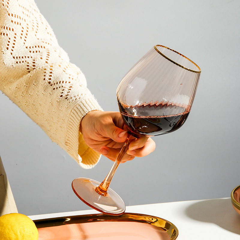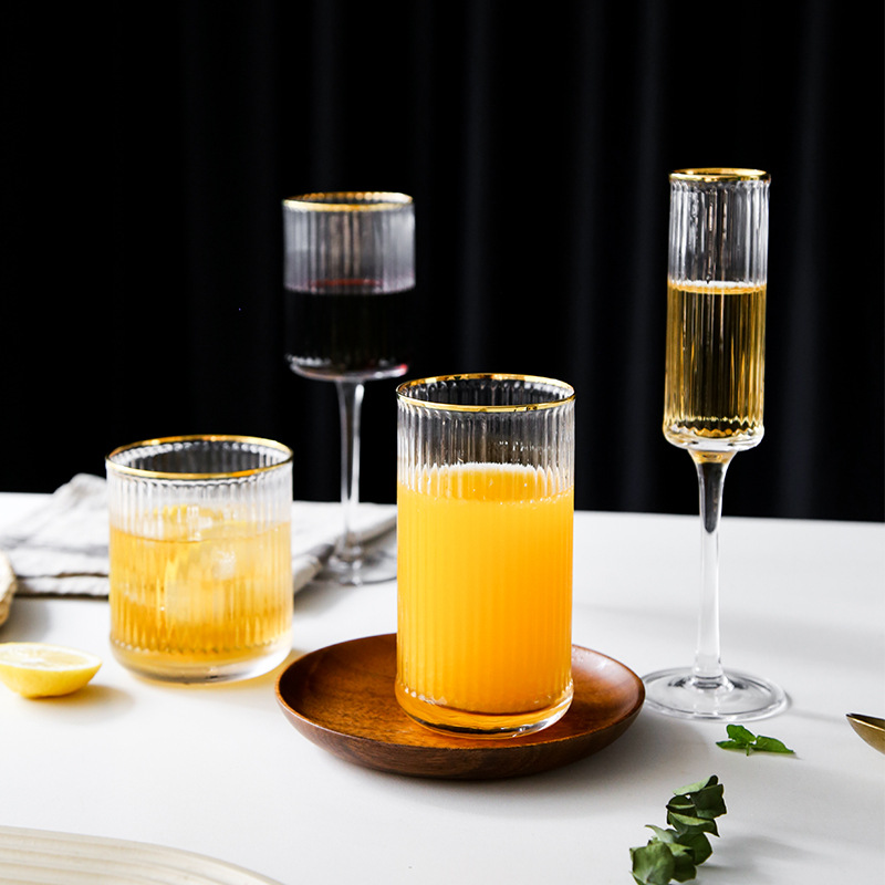 緑典北欧シンプル縦紋グラス創意サンゴ色金辺ワイングラス家庭用高足カップシャンパンカップ