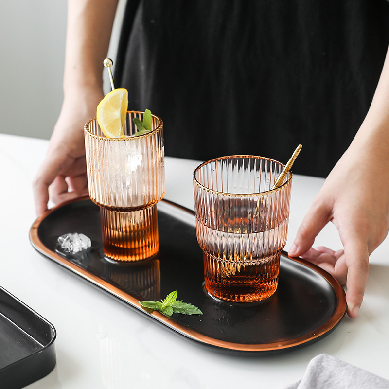 緑典シンプルストライプ金辺ガラスコップサンゴ色ガラスシャンパングラス家庭用高足カップ