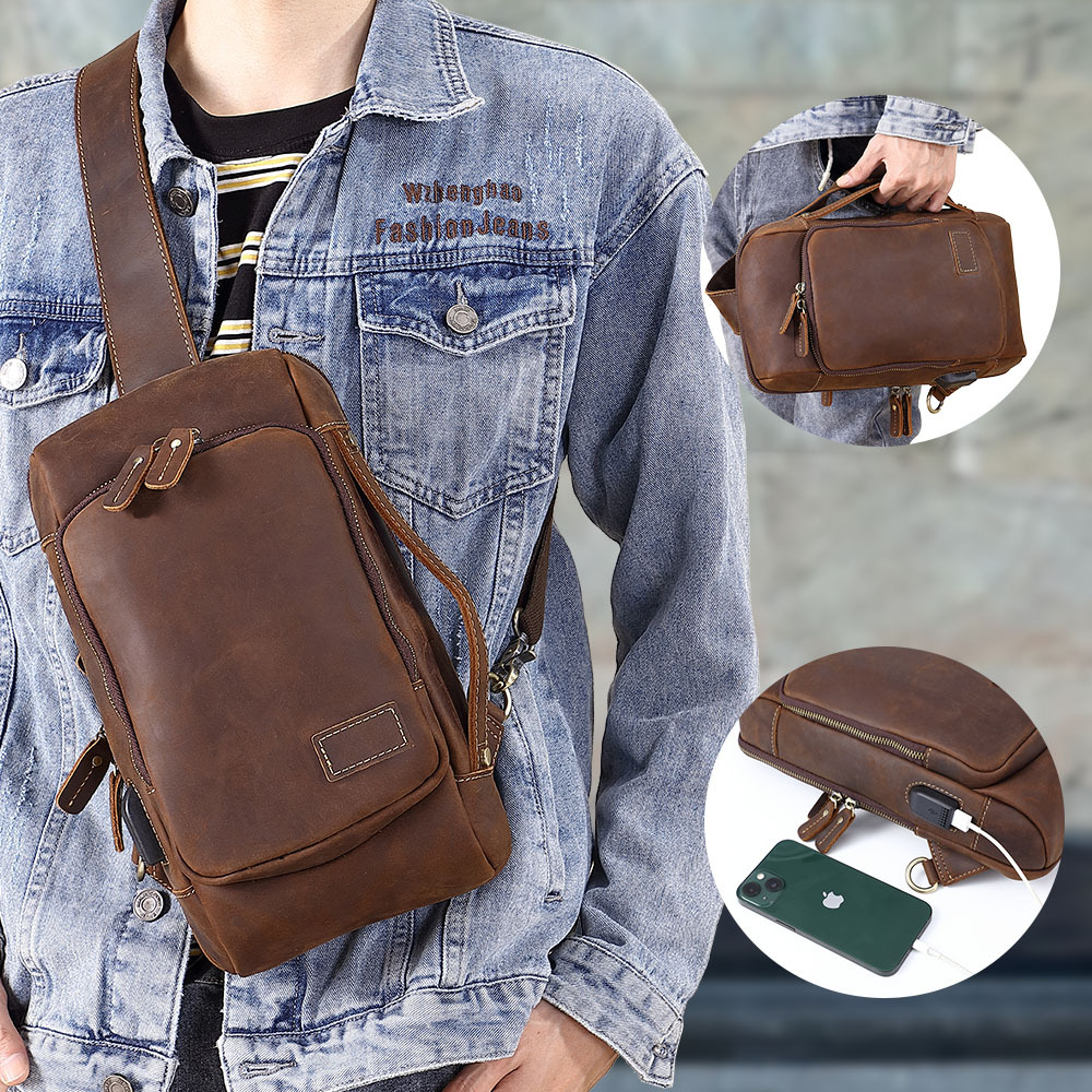クロスボーダー新型チェストバッグレトロ男性バッグ本革ウエストバッグアウトドアスポーツバッグ牛革ショルダーバッグ机関バッグ多机能