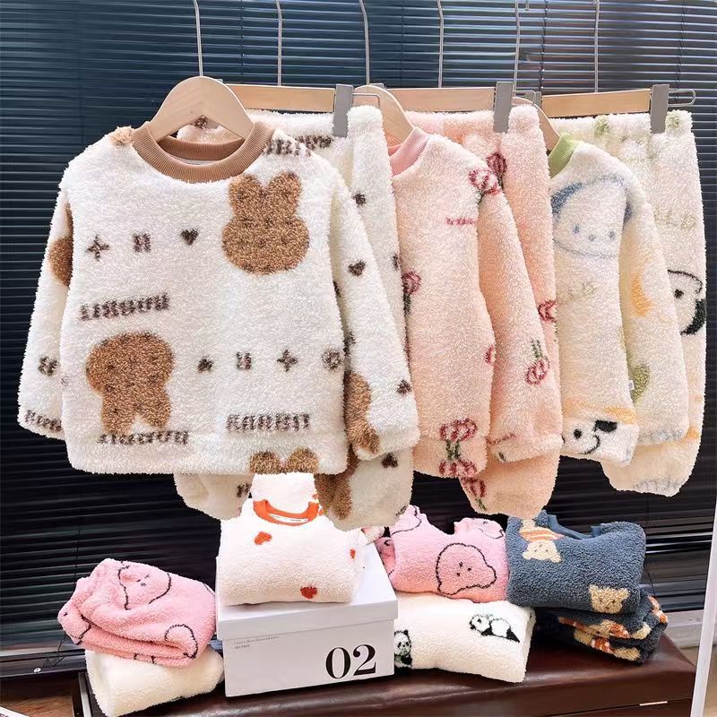 2024子供用の赤ちゃんの下着セットの男の子と女の子の冬のベルベットは、カジュアルな保温パジャマを2つセット厚くしています