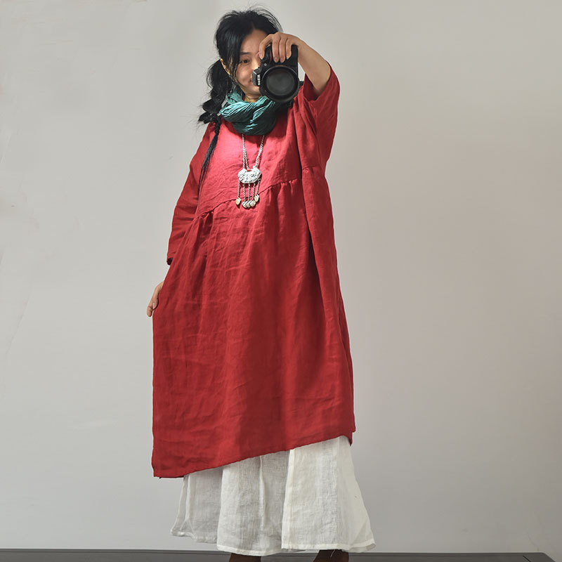 時年/春秋タイプのオリジナル亜麻の小さいシャツのゆったりしたバックルの上着は純色の丸首の長袖の文芸のシャツを合わせます。