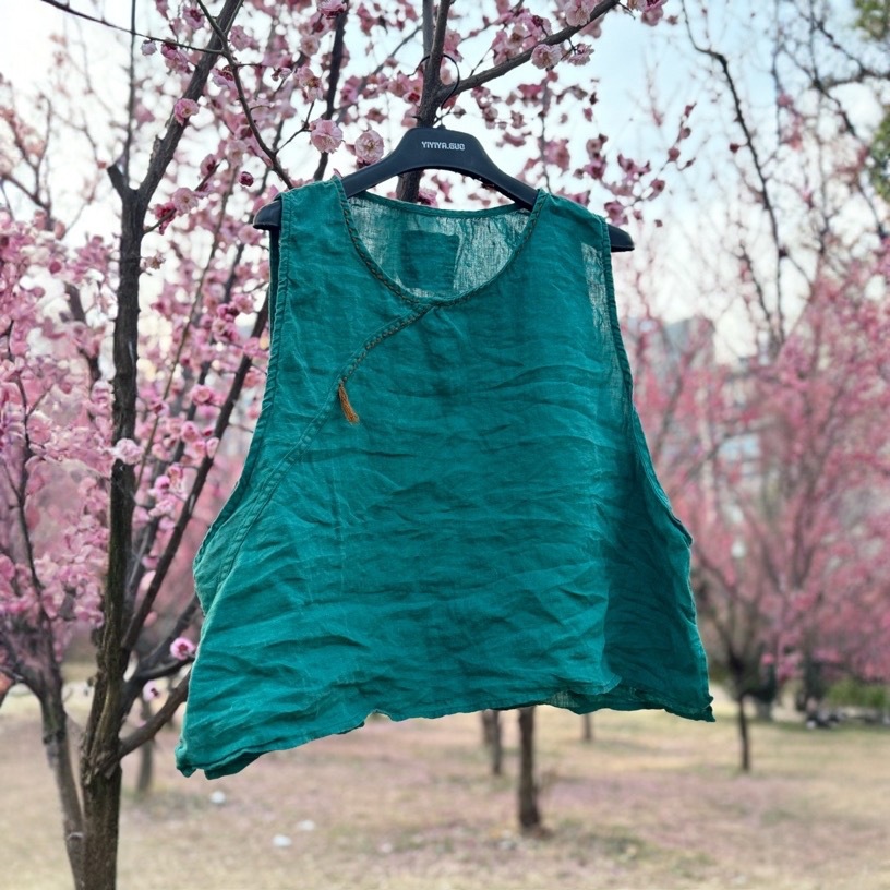 4411砂洗亜麻丸襟民族風女性馬甲手縫い流蘇斜襟文芸馬挟み