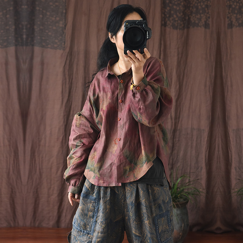 思い出/オリジナル亜麻女装春夏新作ラミー麻デジタルプリント上着文芸清新盤ボタンショートシャツ
