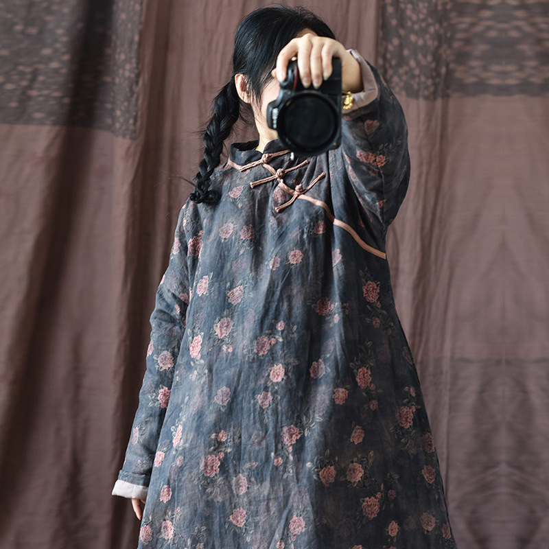 木のほとり/自作の斜め襟のゆったりした皿は中の長い綿服の香雲の糸のプリントの亜麻の復古の禅の意の保温の綿服を掛けます。
