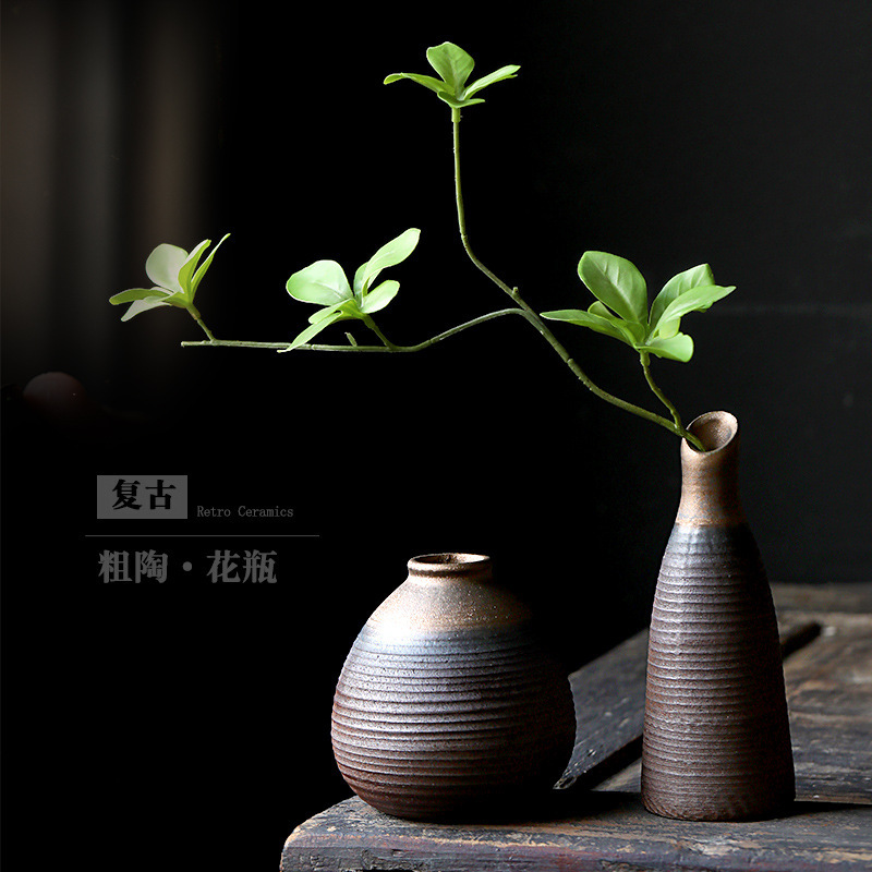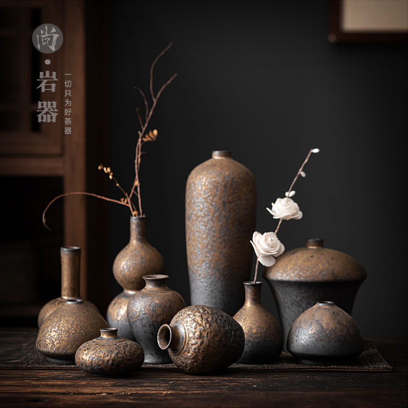 金箔セラミック小さな花瓶、レトロなドライフラワーアレンジメント、水耕栽培の粗い陶器の花器、デスクトップの装飾、禅スタイルの家庭用家具