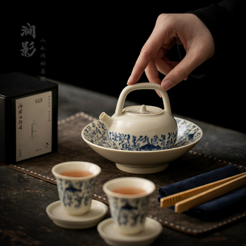 小さなカンフー茶セット、釉薬入り青と白のハンドル付きポット、ポット 1 個とカップ 2 個、オフィスの受付ティーセット、ギフト
