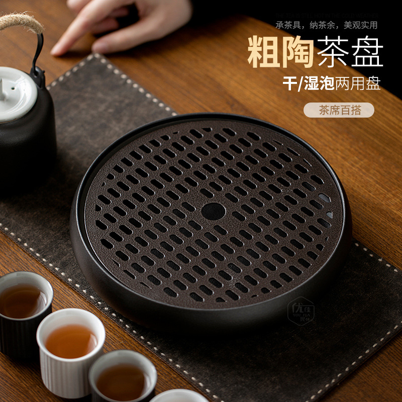 粗い陶器のティートレイ、丸い水貯蔵小型ティーテーブル、家庭用ティーセット、ドライティートレイ、ティーシーライト、軽い高級感、シンプルな新しい中国風のティートレイ