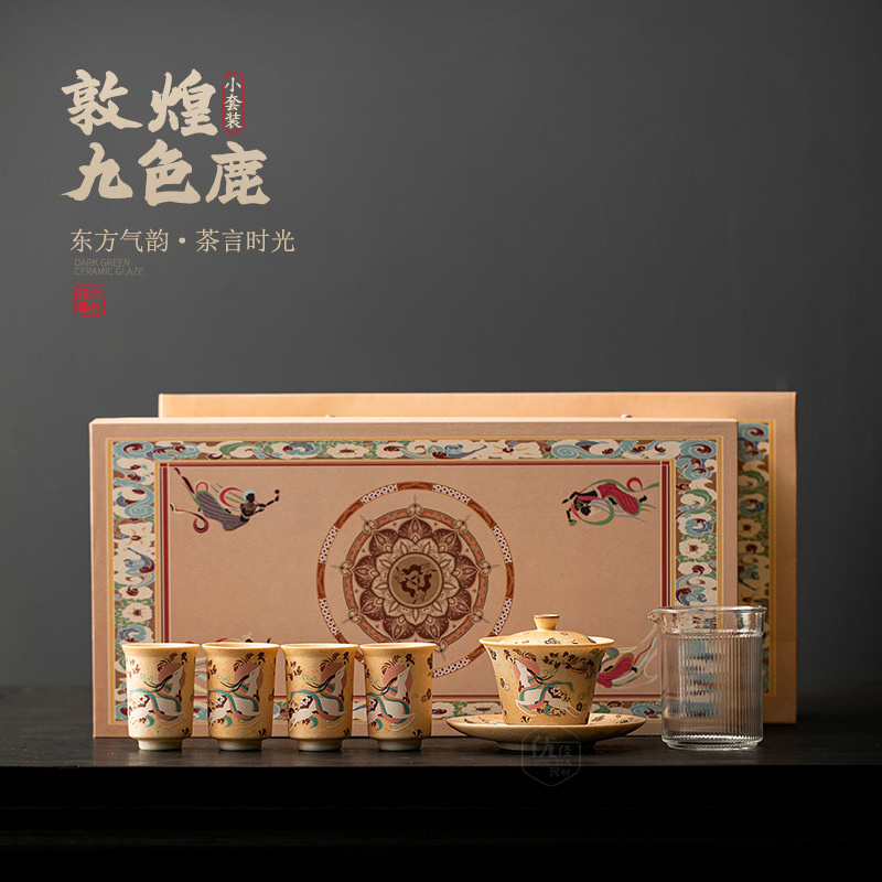 国潮風九色鹿工夫茶器陶磁器三才蓋茶杯公杯セット茶器高級ギフトボックス
