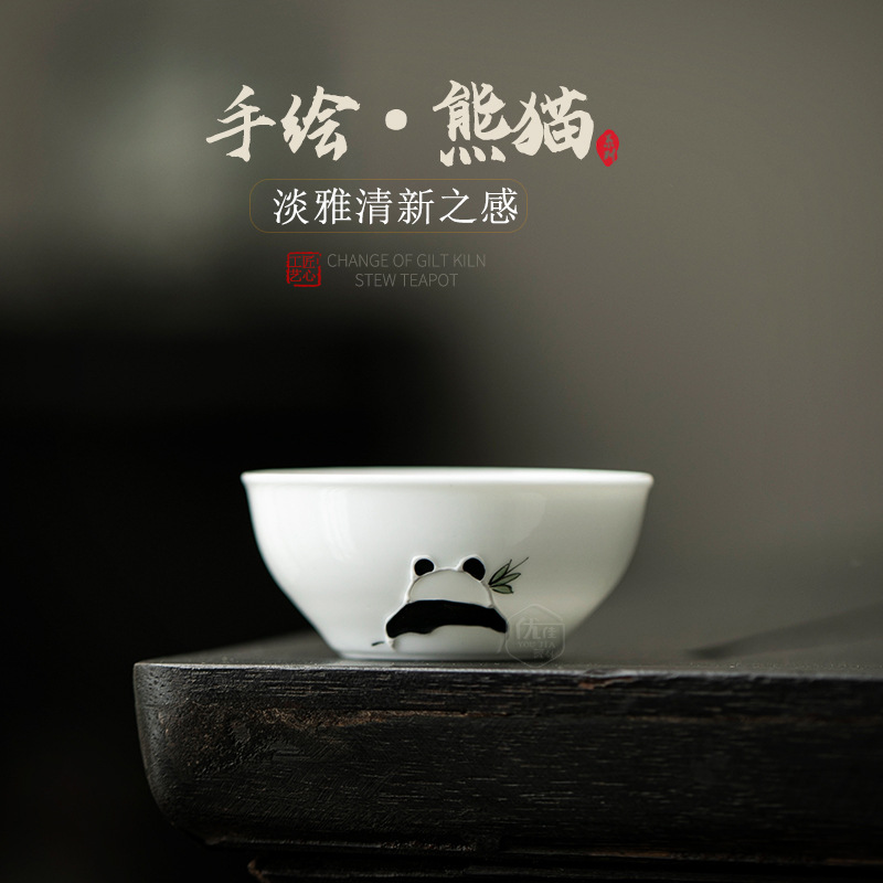白磁の手描きのパンダのお茶の杯の陶磁器の家庭用の工夫の茶器の小さい茶碗の釉薬の下で彩りを飲んでお茶の杯を飲んで香りを嗅ぎます。
