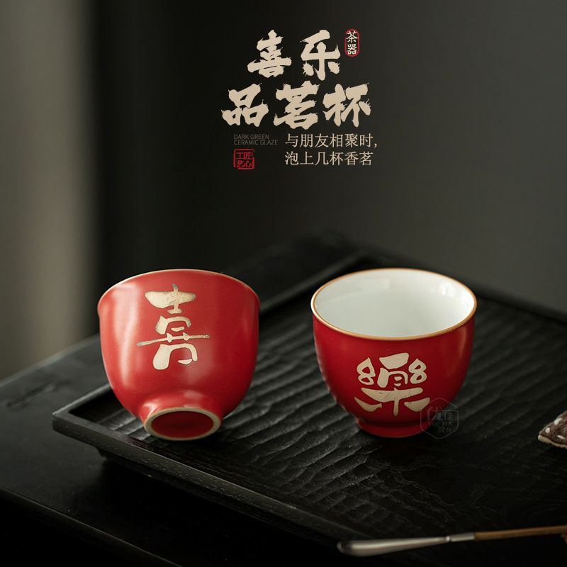 赤い喜びのお茶の杯の中国式のお茶の杯のレトロな陶磁器の家庭用の工夫の茶器はお茶の杯の個人の専用の1杯を飲みます。