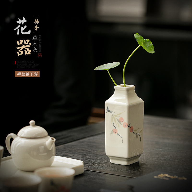 草灰手描き柿花瓶中国風のリビングルームの装飾品ミニフラワーデバイスデスクトップ装飾水耕ドライフラワーフラワーアレンジメント