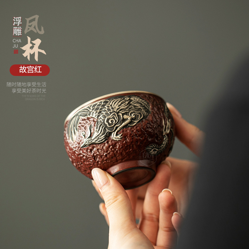 レリーフ龍鳳呈祥ティーカップ手作り銀対カップ品茗杯陶磁器家庭用押えカップ大サイズティーカップ単杯