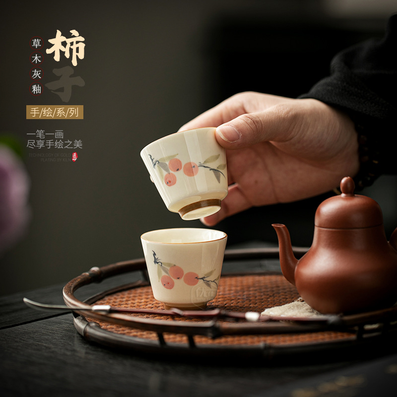 柿柿如意手描きカップ高級白磁器個人専用品茗杯陶磁器工夫単杯聚香杯茶碗