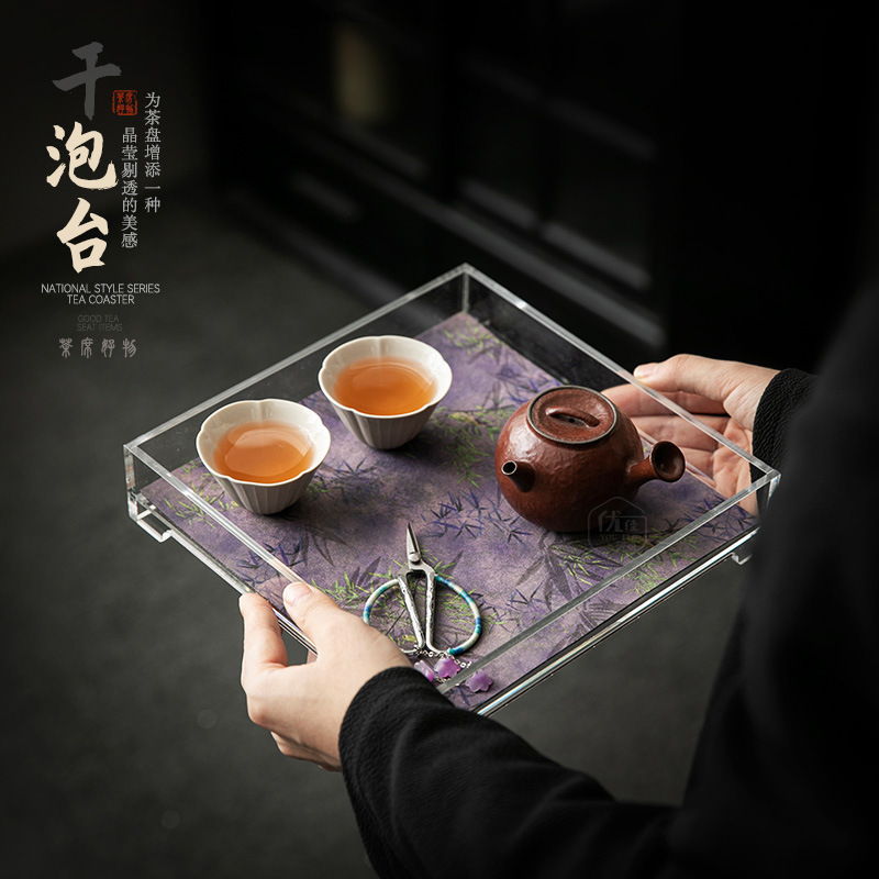 透明アクリル正方形収納盤シンプル家庭用茶トレー乾燥泡小茶台防水織錦茶席セット
