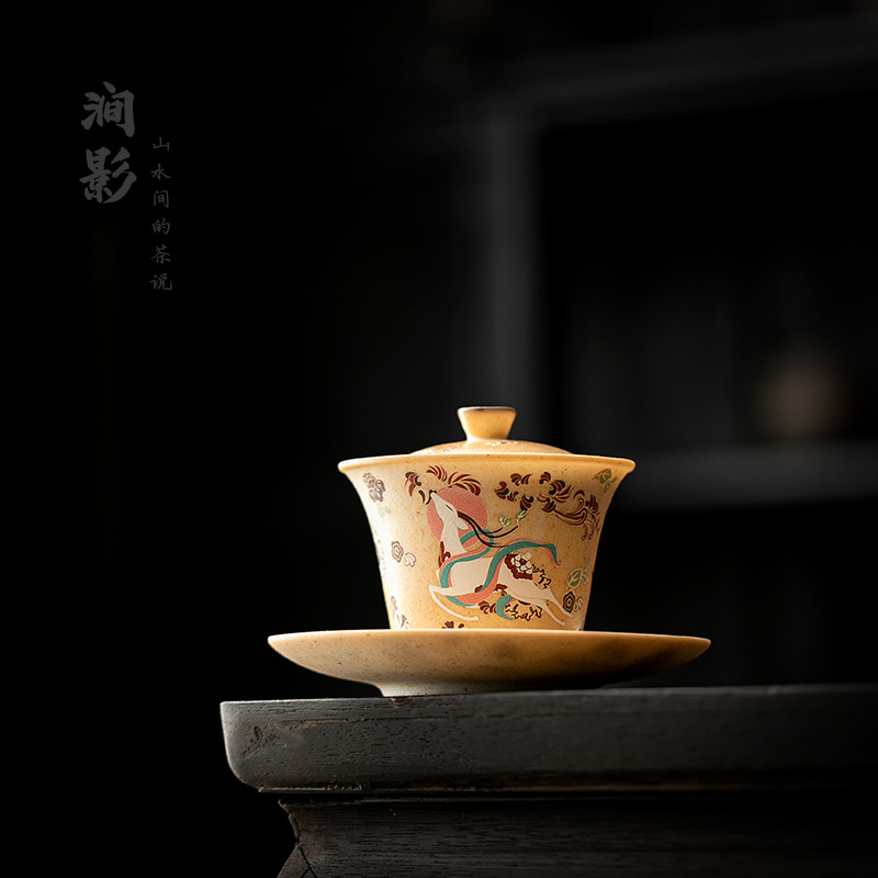 敦煌の9色の鹿の陶磁器の3才の蓋の碗の大きいサイズのお茶の杯の復古する家庭の工夫の茶器はお茶の碗を浸します。