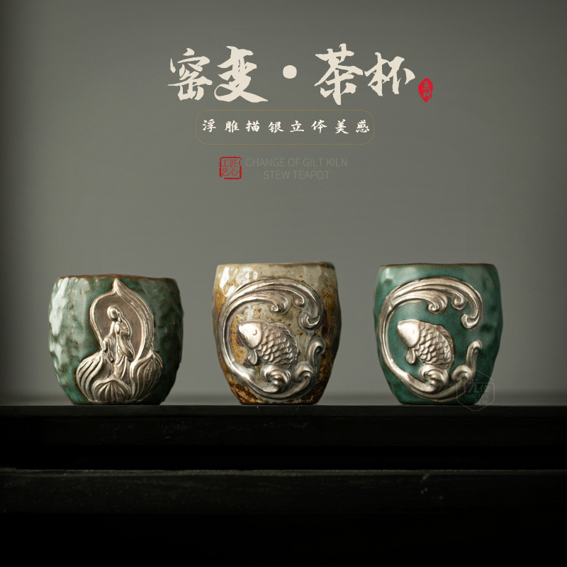 レトロ窯変茶杯大容量主人杯高級個人専用品茗杯浮き彫り銀茶杯お土産
