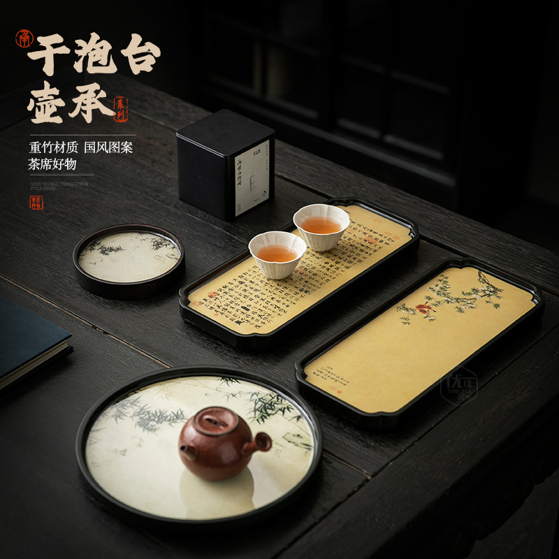国潮風泡茶台竹製壺承茶トレーレトロ乾泡皿小型家庭用工夫茶道具円形茶皿