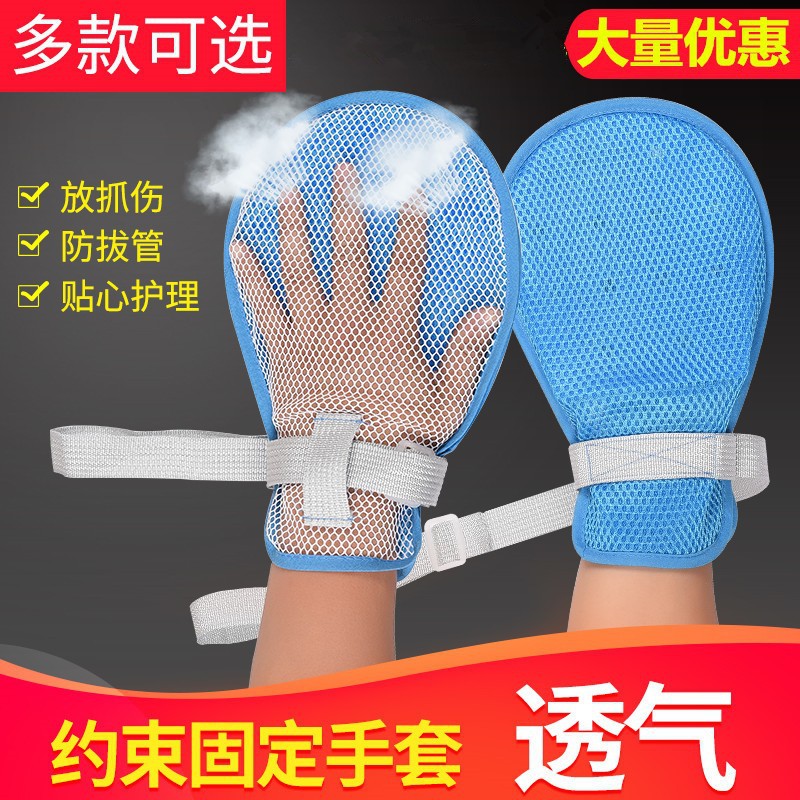 老人の手袋をつかまない抜管防止手袋患者の自己傷防止通気性ダブルネット開口手袋看護固定