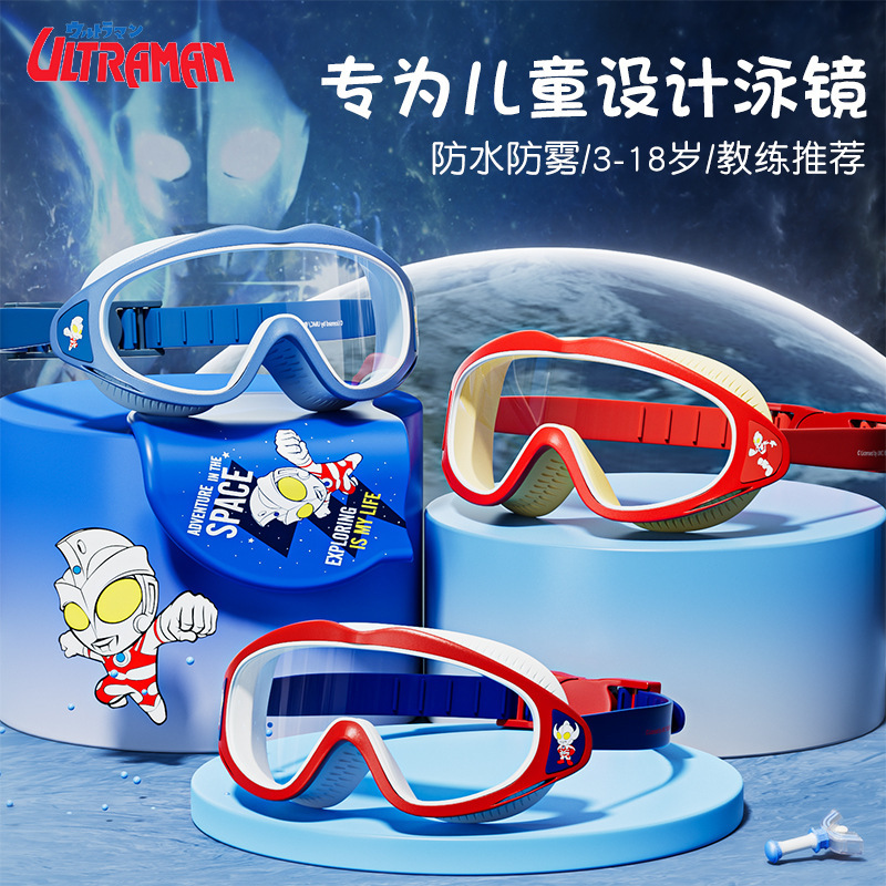 クラシックウルトラマン子供用スイミングゴーグル男の子用高精細防水防曇大型フレームスイミングゴーグルとスイミングキャップセット水泳用品