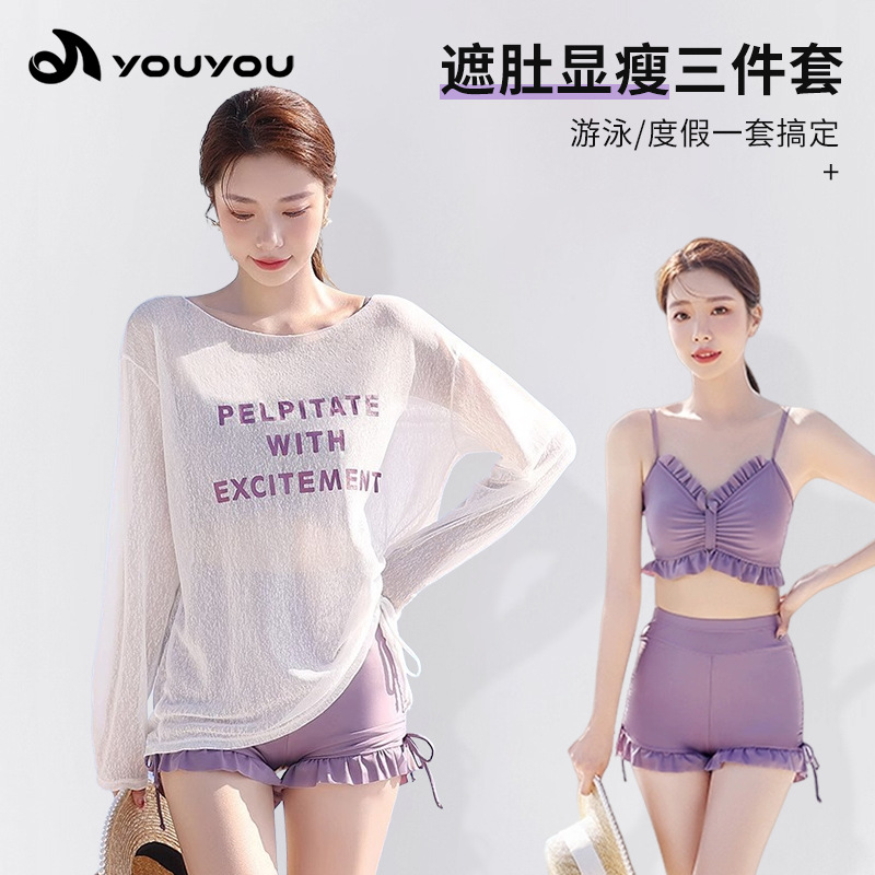 泳衣女泡温泉夏新款分体网红风遮肚显瘦游泳衣三件套保守泳装批发