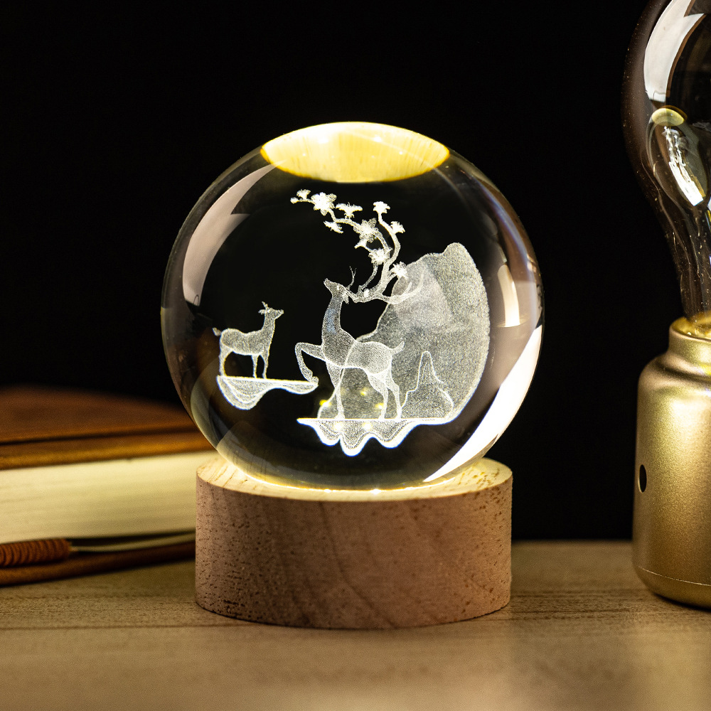 クリエイティブな発光クリスタルガラスボールナイトライト、内側に鹿が彫られている、デスクトップ雰囲気ライトオーナメント、女性への誕生日プレゼント