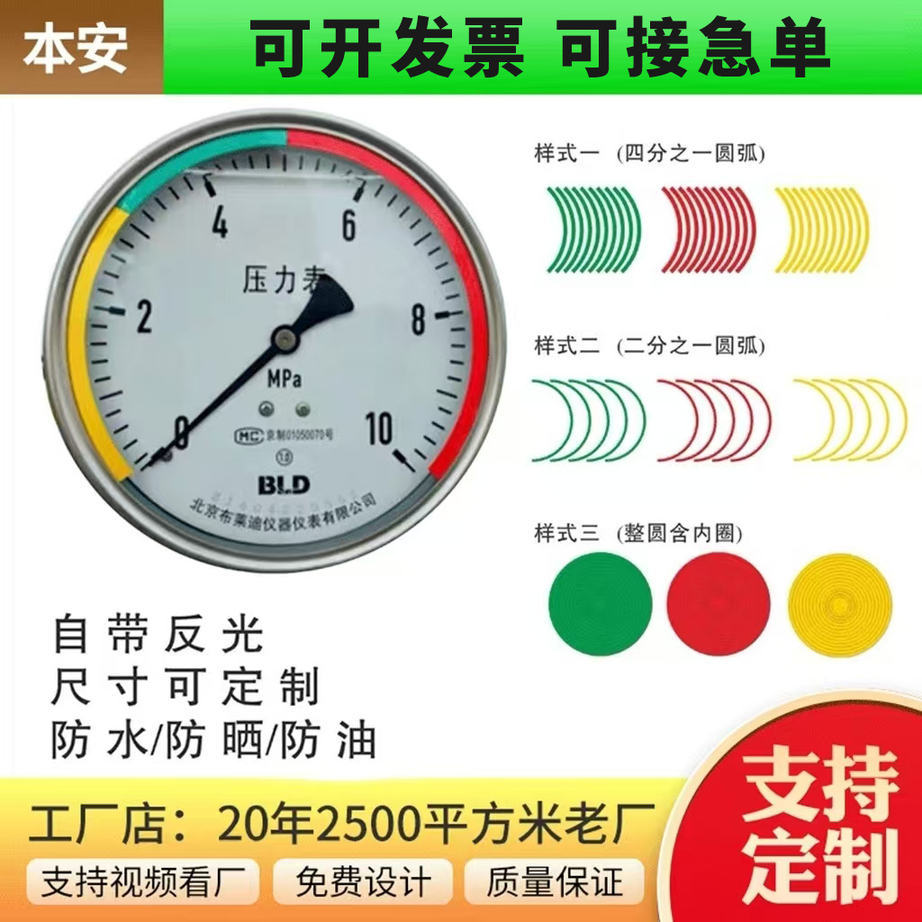 カスタム計器指示標識に圧力計赤黄緑三色ラベル円弧反射圧力計ラベルを貼る