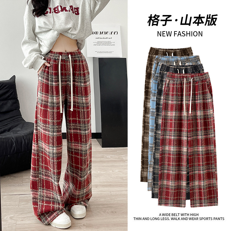 レトロチェック柄パンツレディース秋冬新作ベルベットパンツハイウエストルーズカジュアルパンツスリムフロアレングスストレートワイドレッグパンツ
